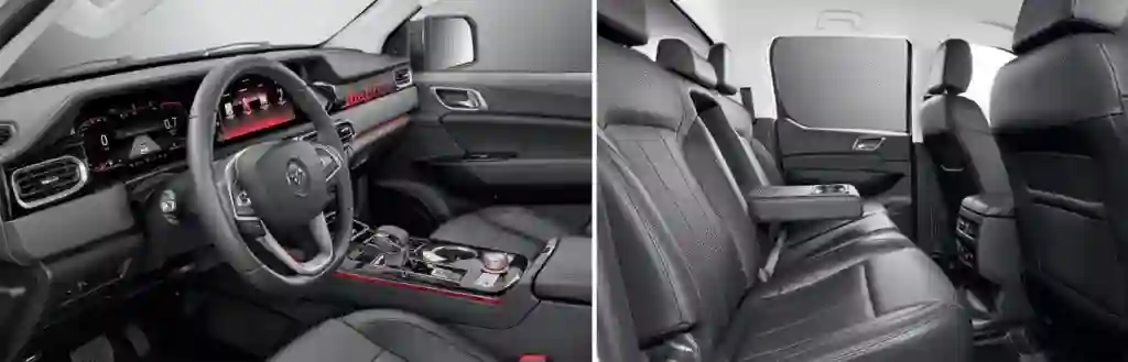 Нет, мы не про плавность хода – никогда полноприводный грузовик, даже маленький, не сравнится здесь с солидным седаном. Зато по отделке салона и оснащению никто не мешает ему выступать в высоком классе. По сравнению с TUNLAND G7 тут изменилось все! Абсолютно новые, удобные кресла с подогревом, вентиляцией и электрорегулировками, отделка искусственной кожей разной текстуры, «металлические» декоративные элементы, подсветка, два больших «телевизора» – цифровая комбинация приборов и дисплей мультимедийной системы, подушки передние, боковые и шторки в придачу. Перечень полезных или просто модных элементов оснащения машины занимает пару страниц мелким шрифтом: подогревы, ездовые ассистенты, беспроводная зарядка, розетка на 220 V, система кругового обзора, бесключевой доступ и запуск, и многое, многое другое.